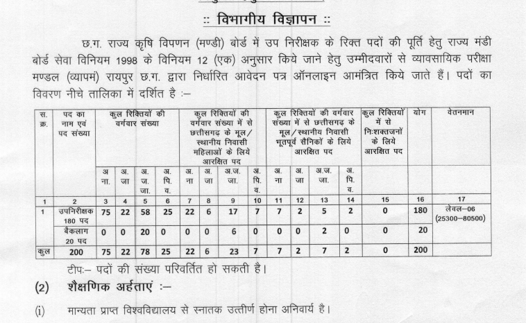 CG Mandi Nirikshak Recruitment 2026 – छ.ग. राज्य कृषि विपणन (मण्डी) बोर्ड के द्वारा उप निरीक्षक के रिक्त पदों की पूर्ति हेतु राज्य मंडी बोर्ड सेवा ...
