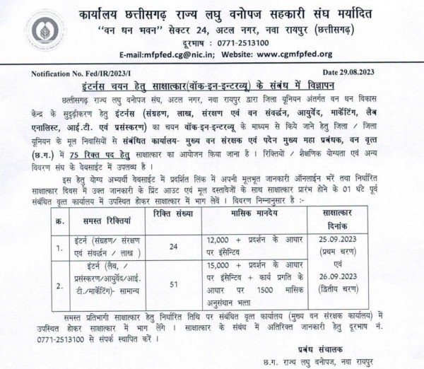 छत्तीसगढ़ राज्य लघु वनोपज संघ, अटल नगर, नवा रायपुर द्वारा जिला यूनियन अंतर्गत ‘वन धन विकास’ केन्द्र के सुदृढ़ीकरण हेतु इंटर्नस (संग्रहण, लाख, संरक्षण एवं वन संवर्धन, आयुर्वेद, मार्केटिंग, लैब एनालिस्ट, आई.टी. एवं प्रसंस्करण) का चयन वॉक इन इन्टरव्यू के माध्यम से किये जाने हेतु जिला जिला यूनियन के मूल निवासियों से संबंधित कार्यालय- मुख्य वन संरक्षक एवं पदेन मुख्य महा प्रबंधक, वन वृत्त (छ.ग.) में 75 रिक्त पद हेतु साक्षात्कार का आयोजन किया जाना है। रिक्तियों शैक्षणिक योग्यता एवं अन्य विवरण संघ के वेबसाईट में उपलब्ध है।