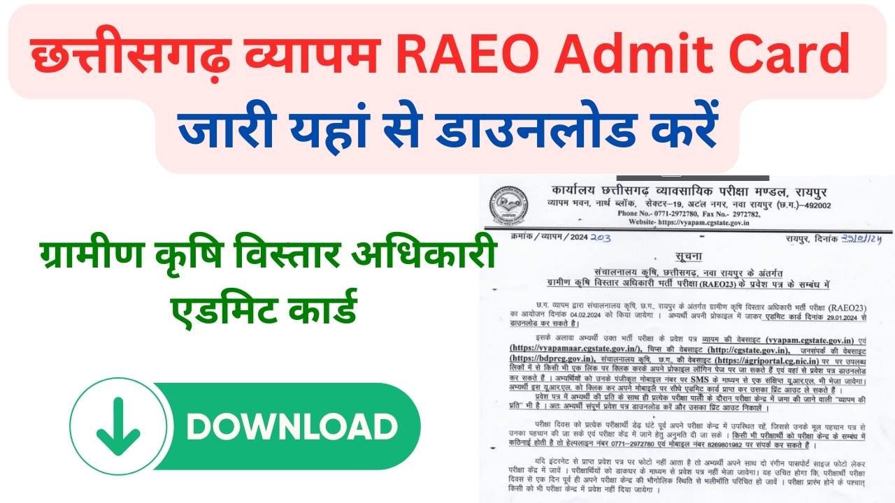 छत्तीसगढ़ ग्रामीण कृषि विस्तार अधिकारी एडमिट कार्ड डाउनलोड 2024 | CG RAEO Admit Card 2024 Released By cg.cgstate.vypam.gov.in