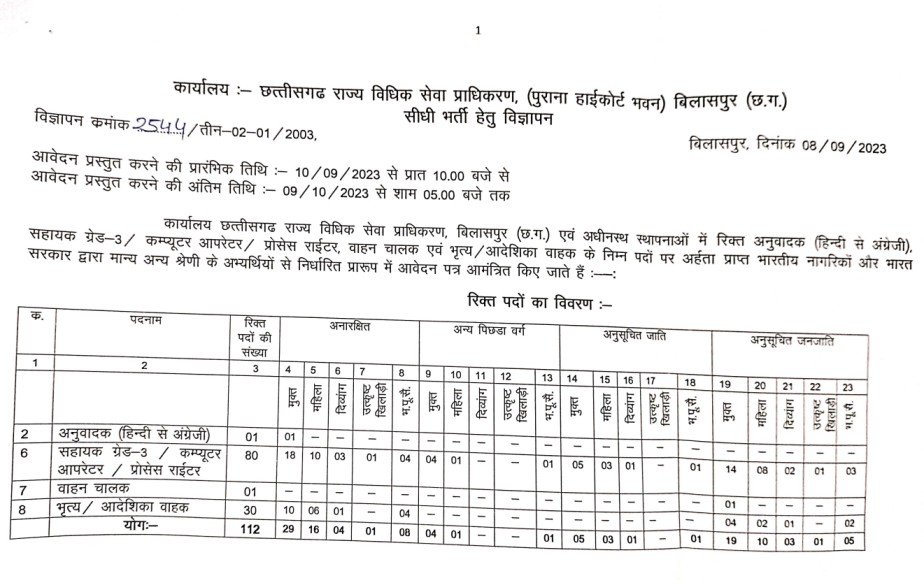 CG Rajya Bilaspur Vidhik Seva Pradhikaran Vacancy 2024 Sidhi Bharti 2024