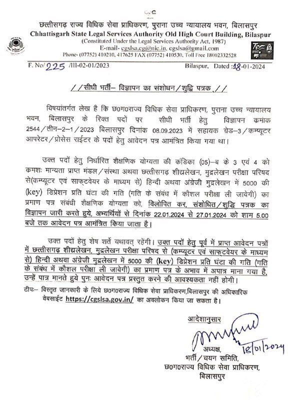बिलासपुर में विभिन्न पदों पर भर्ती 2024: छत्तीसगढ़ राज्य विधिक सेवा प्राधिकरण में डाटा एंट्री आपरेटर के 80 पदों के लिए मंगाए गए हैं आवेदन, देखें पूरी डिटेल new fresher job requirements Bilaspur jobrecruitment 2024