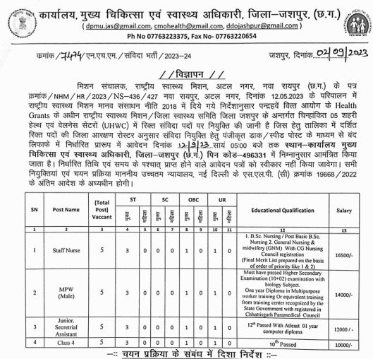 छत्तीसगढ़ राष्ट्रीय स्वास्थ्य मिशन विभाग में निर्देशानुसार पन्द्रहवें वित्त आयोग के Health Grants के अधीन राष्ट्रीय स्वास्थ्य मिशन / जिला स्वास्थ्य समिति जिला जशपुर के अन्तर्गत चिन्हांकित 05 शहरी हेल्थ एवं वेलनेस सेंटरों (UHWC) में रिक्त संविदा पदों पर नियुक्ति की जानी है | स्टाफ नर्स, जूनियर असिस्टेंट, CLASS 4 भर्ती 2023 अधिसूचना जारी किया गया है. इच्छुक उम्मीदवार शैक्षणिक योग्यता ,आयु सीमा दक्षता व पात्रता मापदण्ड विभागीय विज्ञापन जशपुर कार्यालय मुख्य चिकित्सा एवं स्वास्थ्य अधिकारी, जिला- जशपुर भर्ती से जुड़े समस्त जानकरी इस पोस्ट में प्राप्त कर सकते हैं. रिक्त पदों का वर्गवार विवरण निम्नानुसार है:- रिक्त पदों की अधिक जानकरी के लिए इस पोस्ट को पूरा पढ़े का अवलोकन करे |
