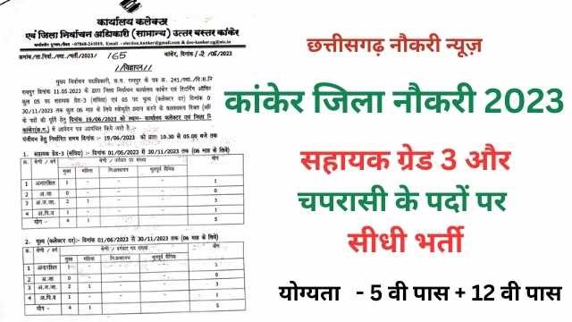 जिला कांकेर Bharti 2023 निर्वाचन कार्यालय विभाग कांकेर के द्वारा चपरासी, सहायक ग्रेड 03 के 10 पदों के लिए विभाग ने अधिसूचना जारी किए गए है. इच्छुक उम्मीदवार निर्वाचन कार्यालय विभाग कांकेर भर्ती से संबंधित शैक्षणिक योग्यता, आयु सीमा दक्षता व पात्रता मापदण्ड विभागीय विज्ञापन कांकेर Job Notification से जुड़े समस्त जानकरी इस पोस्ट में प्राप्त कर सकते हैं